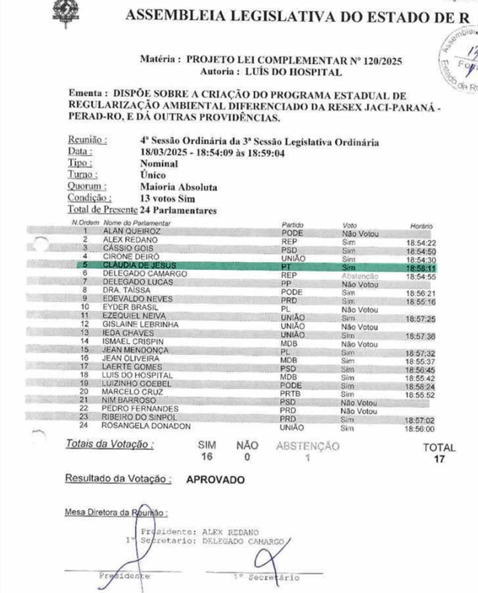 Entre os 17 votos favoráveis à proposta, destacou-se o da deputada estadual Cláudia de Jesus (PT), única representante do partido na Casa Legislativa. A parlamentar, em sua biografia oficial, afirma ter atuação voltada à defesa da agricultura familiar, reforma agrária e diálogo com movimentos sociais .