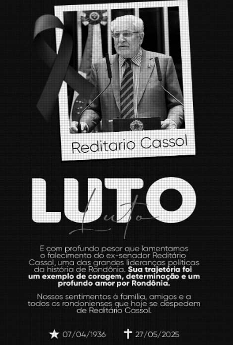 Em nota oficial, Luizinho destacou a importância de Reditário para o desenvolvimento do estado e sua longa trajetória na vida pública. “Reditário Cassol foi uma das grandes lideranças políticas de Rondônia. Com uma trajetória marcada pelo compromisso com o desenvolvimento do estado, dedicou décadas de sua vida à vida pública, sempre defendendo com firmeza os interesses da população rondoniense no Congresso Nacional”, afirmou o parlamentar.