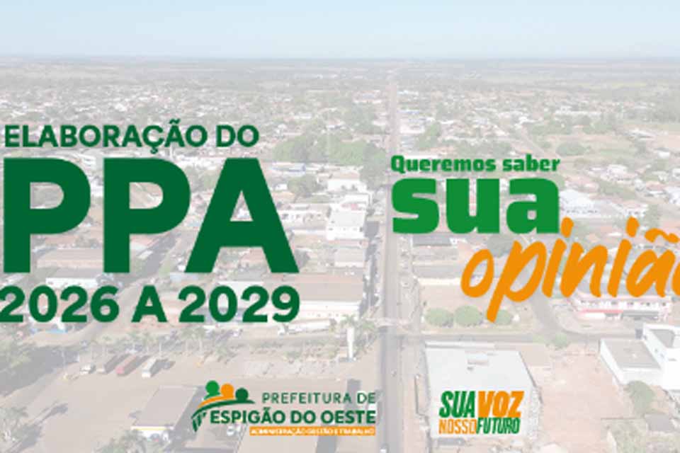 A Prefeitura de Espigão do Oeste convida toda a população a participar da elaboração do Plano Plurianual (PPA) 2026–2029. Este é o momento de contribuir com ideias, sugestões e propostas que ajudarão a definir o rumo do nosso município nos próximos quatro anos.
