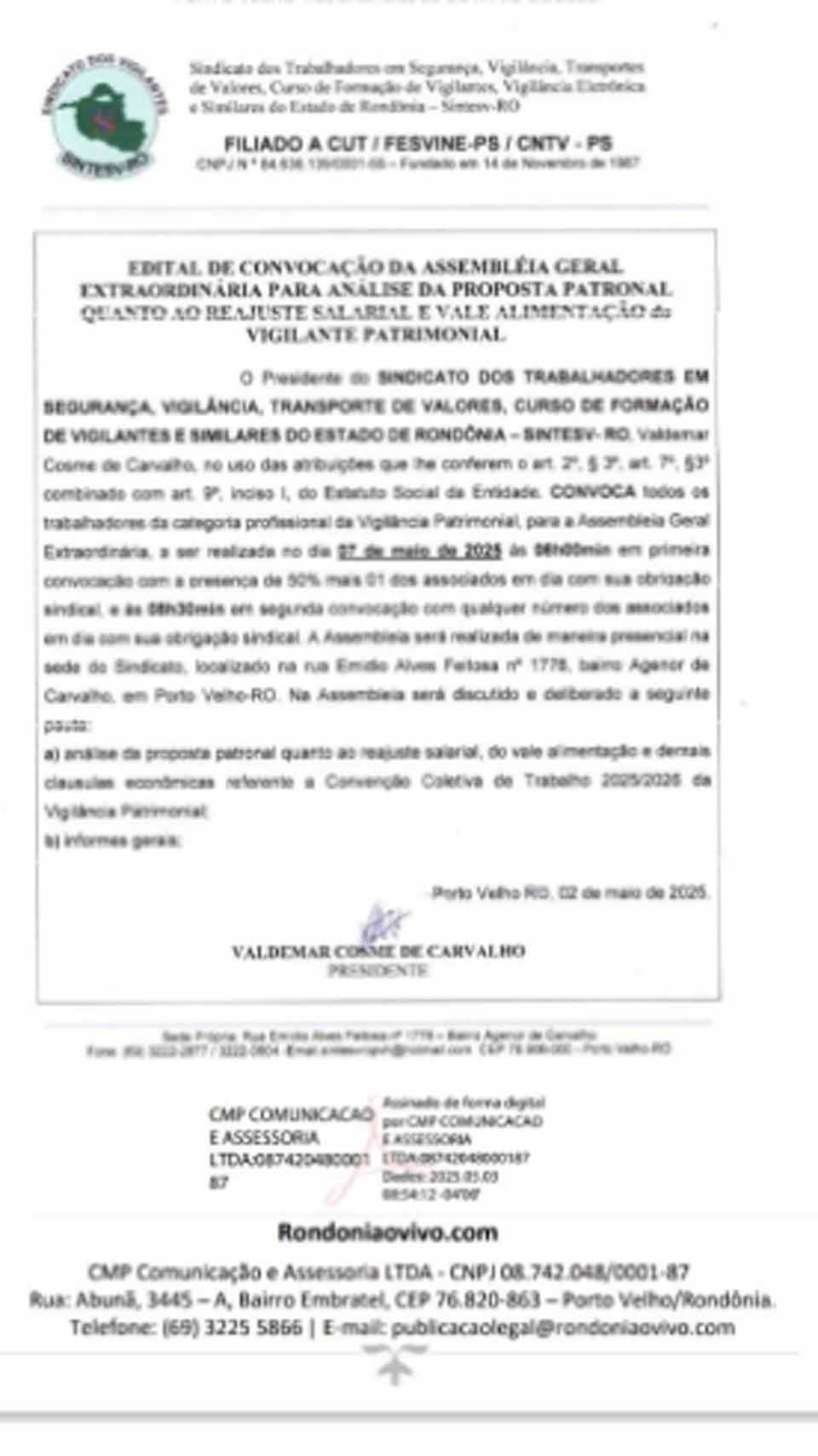 O Presidente do SINDICATO DOS TRABALHADORES EM SEGURANÇA, VIGILÂNCIA, TRANSPORTE DE VALORES, CURSO DE FORMAÇÃO DE VIGILANTES E SIMILARES DO ESTADO DE RONDÔNIA – SINTESV- RO, Valdemar Cosme de Carvalho, no uso das atribuições que lhe conferem o art. 2º, § 3º, art. 7º, §3º combinado com art. 9º, inciso I, do Estatuto Social da Entidade. CONVOCA todos os trabalhadores da categoria profissional da Vigilância Patrimonial, para a Assembleia Geral Extraordinária, a ser realizada no dia 07 de maio de 2025 às 08h00min em primeira convocação com a presença de 50% mais 01 dos associados em dia com sua obrigação sindical, e às 08h30min em segunda convocação com qualquer número dos associados em dia com sua obrigação sindical.