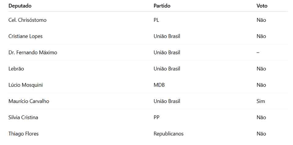 A bancada federal de Rondônia se dividiu. Dos oito parlamentares do estado, apenas Maurício Carvalho (União Brasil) votou a favor da proposta. Os demais votaram contra ou não registraram voto na sessão.
