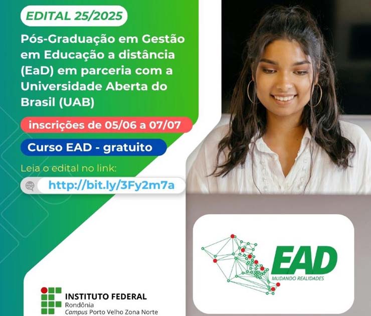 O Instituto Federal de Educação, Ciência e Tecnologia de Rondônia (IFRO), Campus Porto Velho Zona Norte, abrirá em breve as inscrições para o processo seletivo do curso de Pós-Graduação Lato Sensu em Gestão em Educação a Distância, na modalidade EaD (Educação a Distância), com ingresso no segundo semestre de 2025. Ao todo, estão sendo ofertadas 200 vagas, distribuídas entre seis polos da Universidade Aberta do Brasil (UAB).