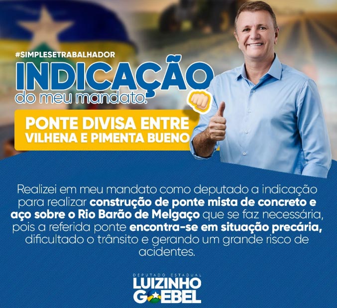 O deputado estadual Luizinho Goebel indicou ao Governo de Rondônia e ao Departamento de Estradas de Rodagem (DER) a construção urgente de uma ponte mista de concreto e aço sobre o Rio Barão de Melgaço, no km 8,5 da Estrada do Capim, trecho que liga a BR-364 ao km 53.