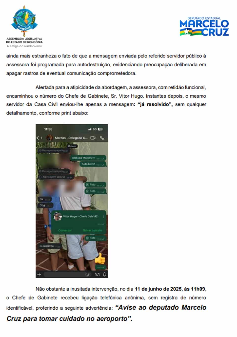 No dia seguinte ao contato, o chefe de gabinete do deputado teria recebido uma ligação anônima contendo a frase “Avise ao deputado Marcelo Cruz para tomar cuidado no aeroporto”. O delegado afirma que a tentativa de vinculá-lo ao episódio é infundada e sem qualquer base material. “Marcelo afirma, sem qualquer prova ou cabimento formal, que fui eu o autor da ligação. Isso é absolutamente inverídico”, diz em sua manifestação.