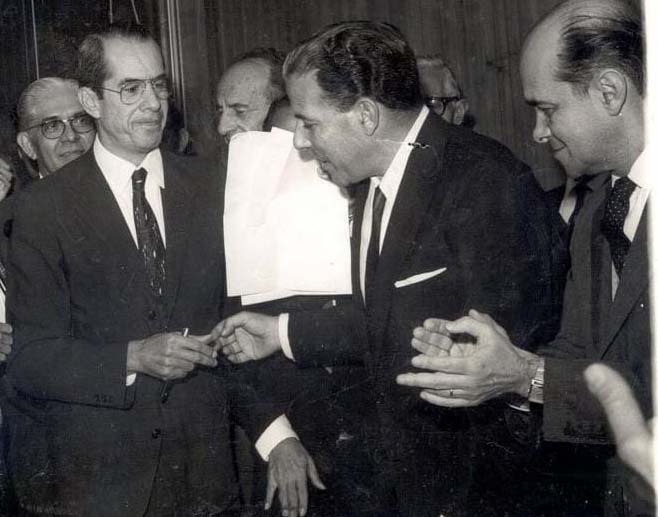Foto: José Guiomar, Jango e Tancredo Neves na assinatura da lei. (Agência de Notícias do Acre)