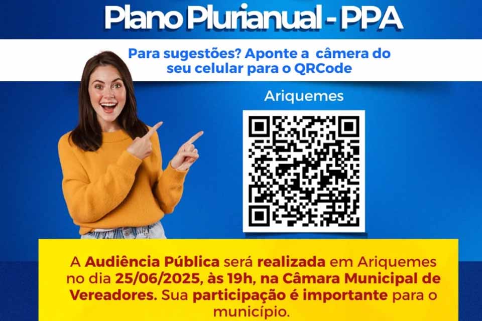 A Prefeitura de Ariquemes convida toda a população para a Audiência Pública de Escuta Popular, que faz parte da elaboração do Plano Plurianual (PPA) 2026-2029 .