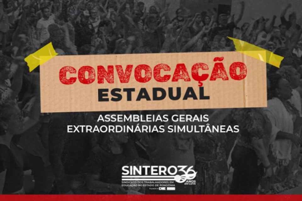 A diretoria do SINTERO convoca os trabalhadores e trabalhadoras em educação da rede estadual para participarem da Assembleia Geral Extraordinária, que será realizada no dia 12 de junho de 2025, às 9h em primeira convocação e às 9h30 em segunda. A assembleia ocorrerá de forma presencial na sede administrativa do SINTERO, em Porto Velho, e simultaneamente nas sedes das 11 regionais distribuídas pelo estado.