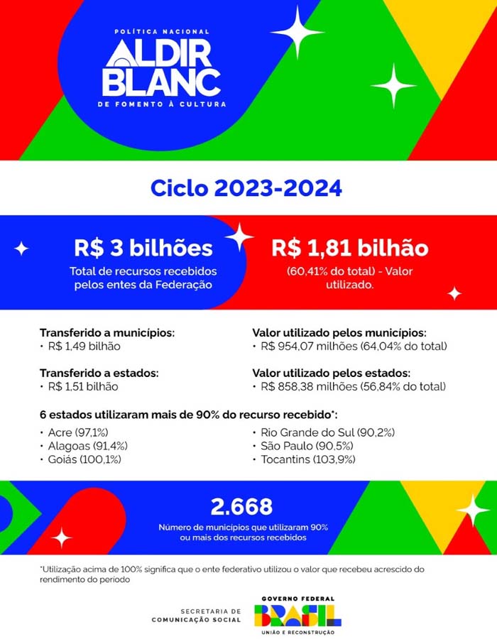 SEGUNDO CICLO – Todas as unidades da Federação e 5.568 municípios aderiram ao segundo ciclo da Aldir Blanc, que prevê o repasse de R$ 12 bilhões para todo o país até 2029. São recursos federais anuais de até R$ 3 bilhões a cada ciclo, disponíveis para investimentos em ações como fomento direto, apoio a Pontos e Pontões de Cultura, manutenção de espaços culturais e obras de infraestrutura.