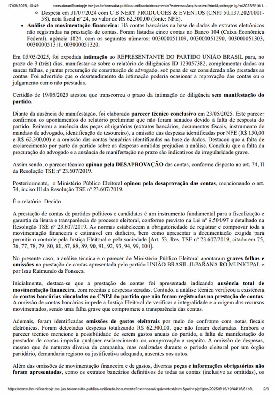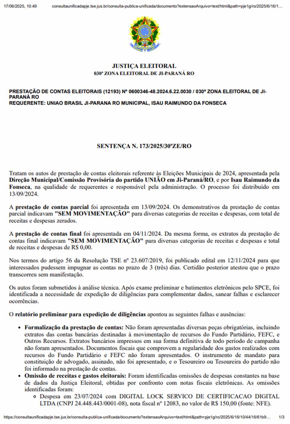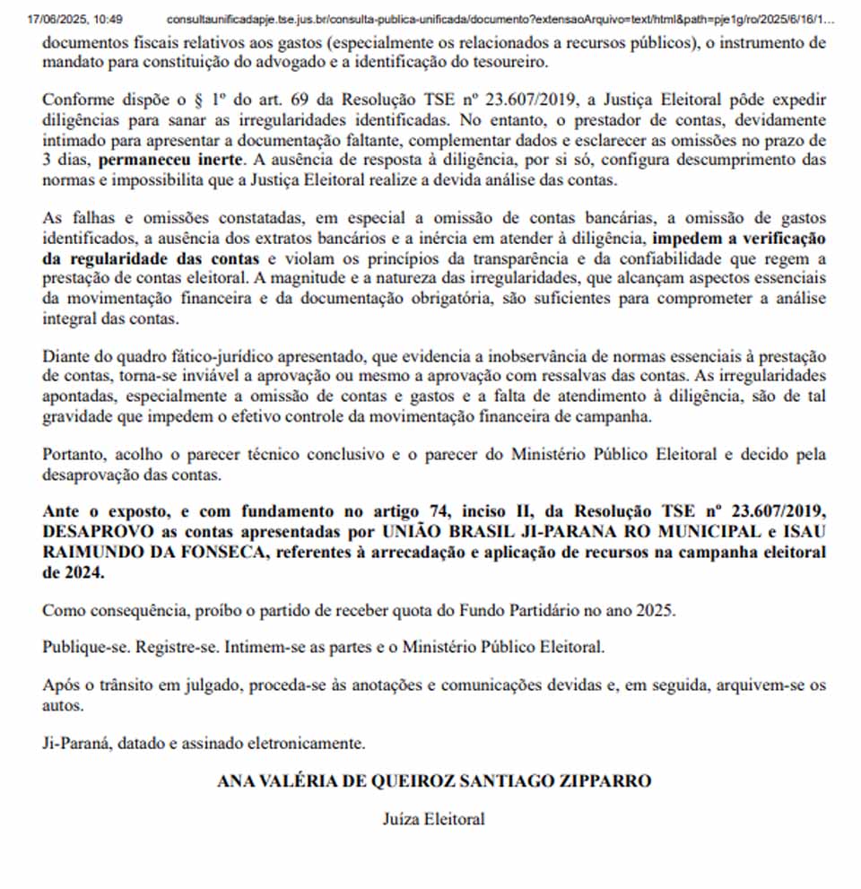 Com base no artigo 74, inciso II, da Resolução TSE nº 23.607/2019, a Justiça Eleitoral desaprovou as contas de Isaú Fonseca e do União Brasil em Ji-Paraná. Como sanção, o partido ficará impedido de receber cotas do Fundo Partidário no exercício de 2025.