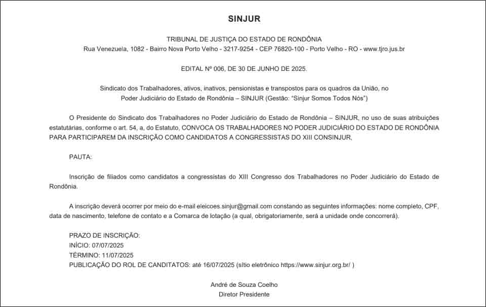 O Sindicato dos Trabalhadores no Poder Judiciário do Estado de Rondônia (SINJUR) publicou, por meio do Edital nº 006, de 30 de junho de 2025, a convocação oficial para que servidores filiados — ativos, inativos, pensionistas e transpostos para os quadros da União — possam se inscrever como candidatos a congressistas do XIII Congresso dos Trabalhadores no Poder Judiciário do Estado de Rondônia (CONSINJUR).