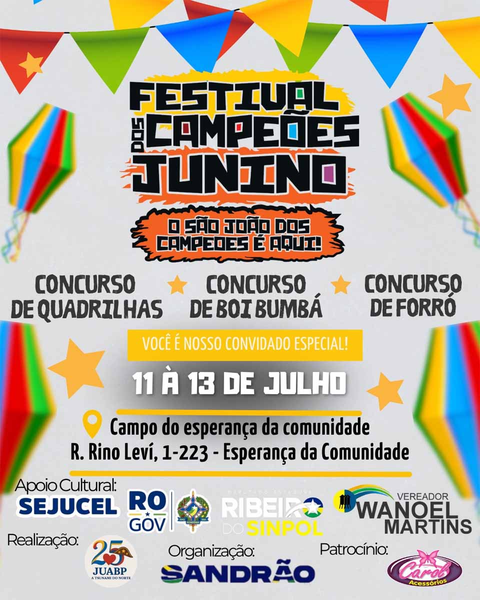 Porto Velho, RO – Entre os dias 11 e 13 de julho, será realizado o "Festival dos Campeões Junino – O São João dos Campeões é Aqui!", no Campo do Esperança da Comunidade, localizado na Rua Rino Levi, n.º 1.223, no bairro Esperança da Comunidade, em Porto Velho. O evento contará com concursos de quadrilhas, boi-bumbá e forró, conforme a programação divulgada pela organização.