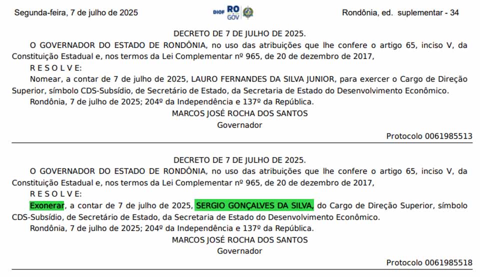 A exoneração foi formalizada no Diário Oficial do Estado, edição suplementar de 7 de julho de 2025. No mesmo ato, foi nomeado para a pasta Lauro Fernandes da Silva Junior.