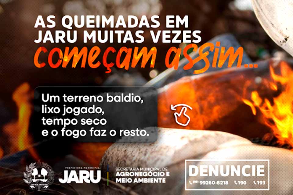 A Prefeitura de Jaru, por meio da Secretaria Municipal de Agronegócio e Meio Ambiente - Semeagro, alerta toda a população para a necessidade de denunciar a ocorrência de queimadas urbanas, cuja incidência aumenta consideravelmente durante o período de estiagem.