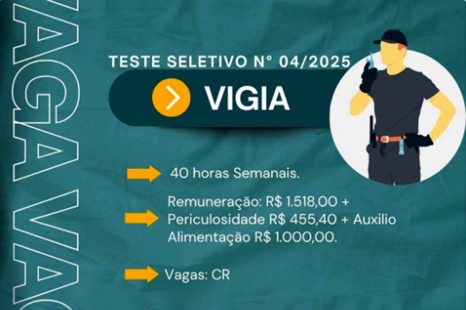 A Prefeitura de Pimenta Bueno, por meio da Secretaria Municipal de Fazenda e Administração Geral, informa que estão abertas as inscrições para o Teste Seletivo Simplificado nº 04/2025, destinado à contratação temporária de servidores para o cargo de Vigia