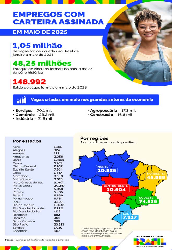 NACIONAL – O Brasil superou a marca de um milhão de vagas de emprego com carteira assinada em cinco meses de 2025. São 1.051.244 de vagas geradas e saldo positivo nos cinco setores da economia avaliados. Nos últimos 12 meses, o acumulado é de 1,62 milhão de vagas. Só no mês de maio, foram quase 149 mil (148.992) postos de trabalho formais. O estoque, que representa o total de vínculos empregatícios formais ativos no país, superou o patamar de 48,2 milhões. É o maior da série histórica.