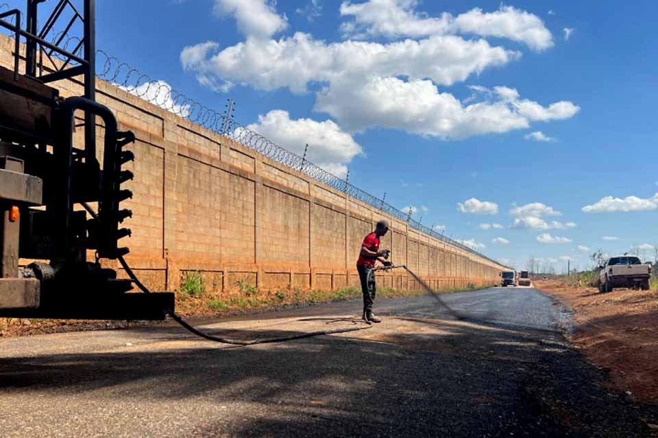Após a compactação do material, foi realizada a imprimação, que é a aplicação de piche, responsável por fixar as camadas e preparar o solo para o acabamento final.