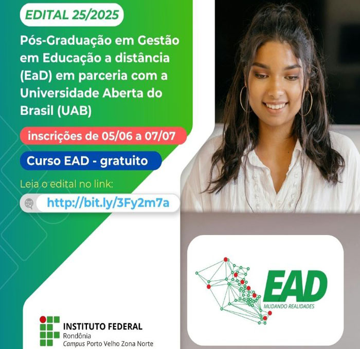 O Instituto Federal de Educação, Ciência e Tecnologia de Rondônia (IFRO), Campus Porto Velho Zona Norte, encerra na próxima segunda-feira (7) as inscrições para o processo seletivo do curso de Pós-Graduação Lato Sensu em Gestão em Educação a Distância, na modalidade EaD (Educação a Distância), com ingresso neste segundo semestre de 2025. Ao todo, estão sendo ofertadas 200 vagas, distribuídas entre seis polos da Universidade Aberta do Brasil (UAB).
