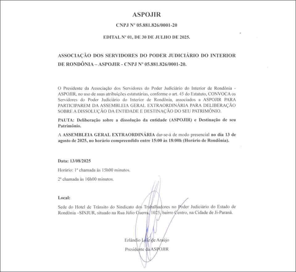 Servidores do Judiciário do interior de Rondônia são convocados para decidir sobre extinção da ASPOJIR em assembleia extraordinária no dia 13 de agosto