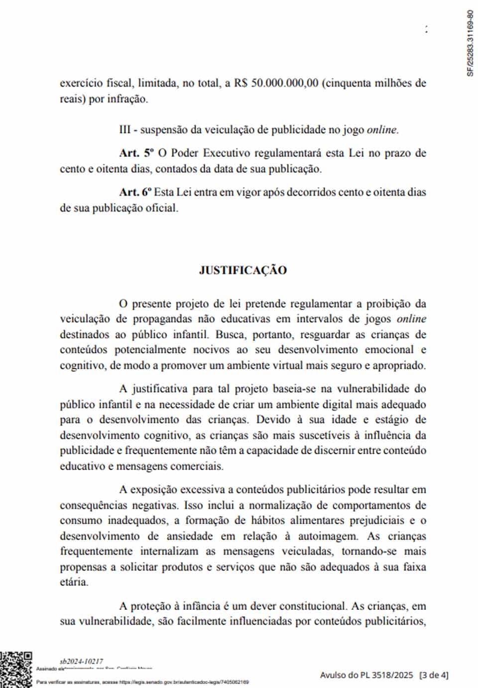 Na justificativa, o senador argumenta que as crianças são expostas cada vez mais cedo ao ambiente digital e acabam vulneráveis a mensagens comerciais embutidas em jogos online. Segundo ele, essa exposição pode “influenciar hábitos de consumo, afetar a alimentação e até prejudicar a autoestima dos pequenos”. Em publicação nas redes sociais, Confúcio Moura afirmou: “Só será permitido o que tiver caráter educativo. Proteger nossas crianças hoje é preparar um futuro mais justo e saudável para todos”.