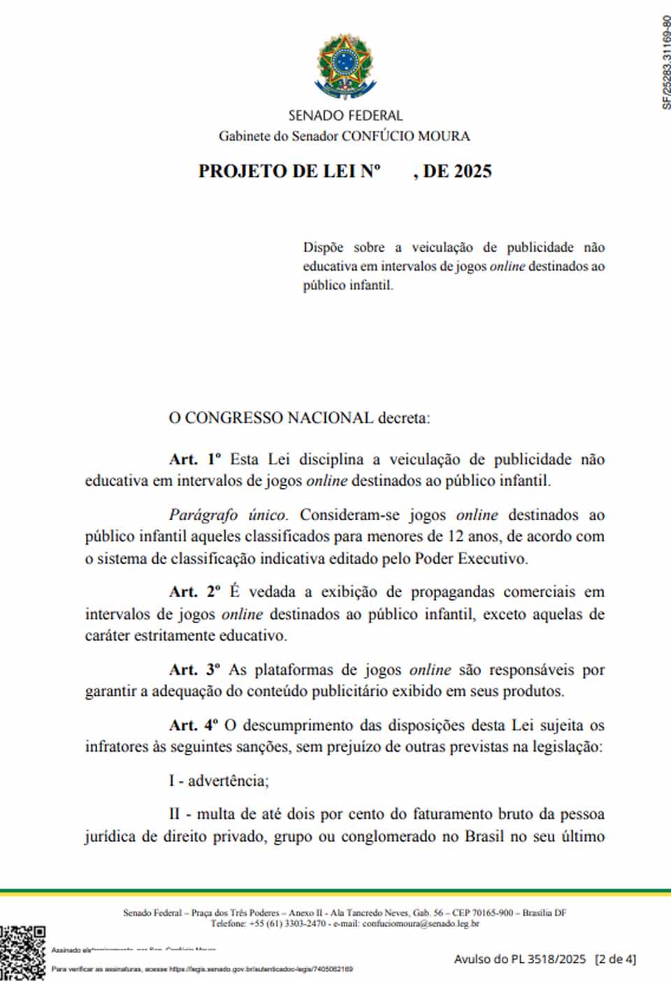 O senador Confúcio Moura (MDB-RO) apresentou no Senado Federal o Projeto de Lei nº 3518/2025, que estabelece regras para a veiculação de publicidade em jogos online destinados ao público infantil. A proposta proíbe propagandas comerciais nesses ambientes, exceto quando tiverem caráter estritamente educativo, e determina a responsabilização direta das plataformas que disponibilizam os jogos.
