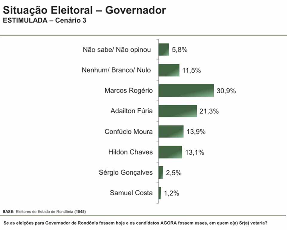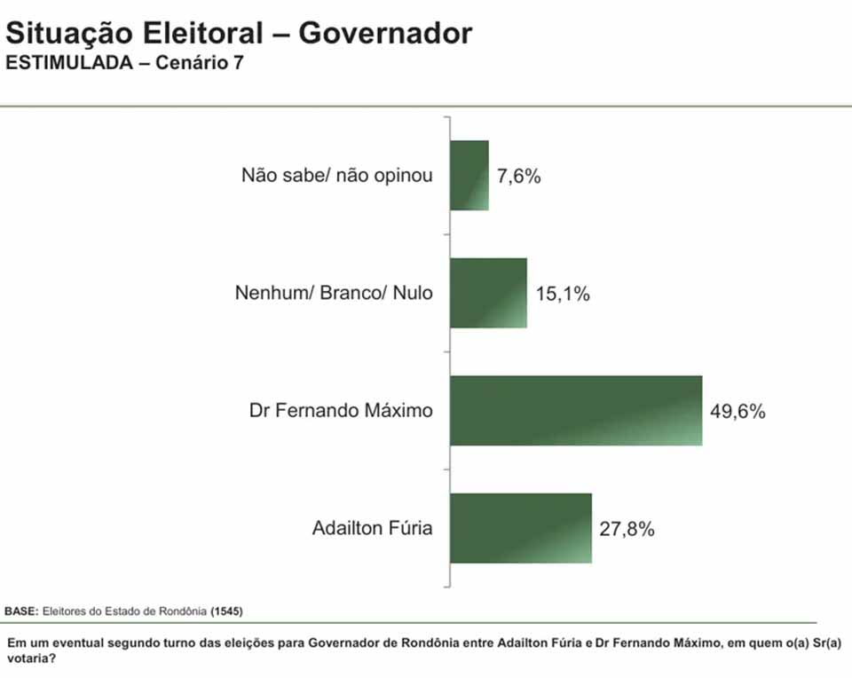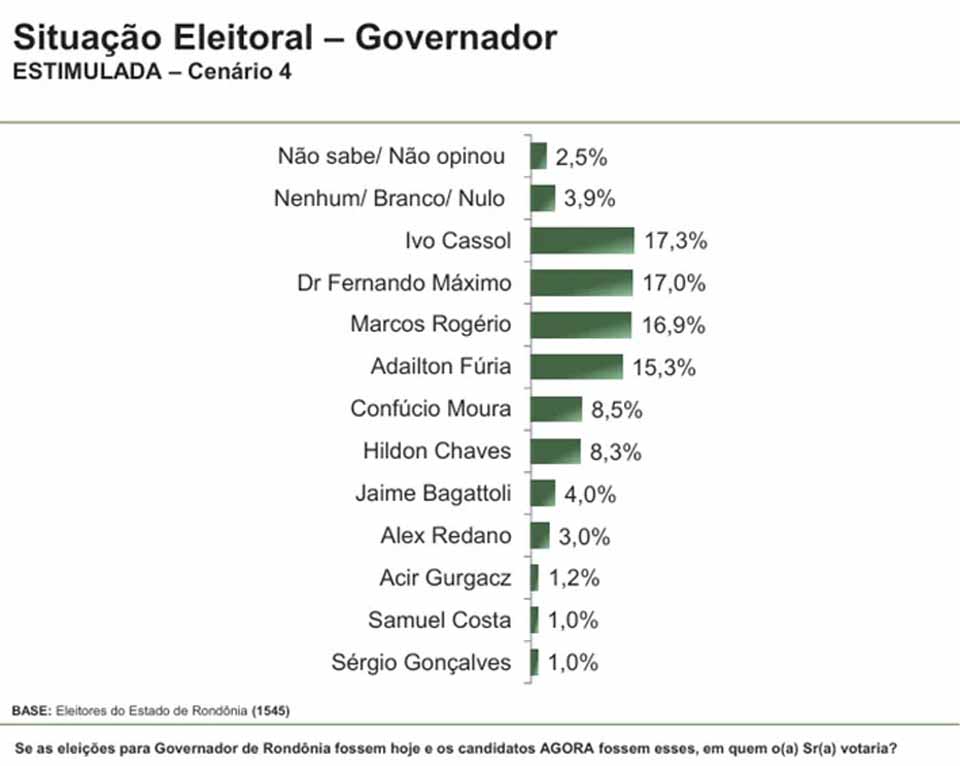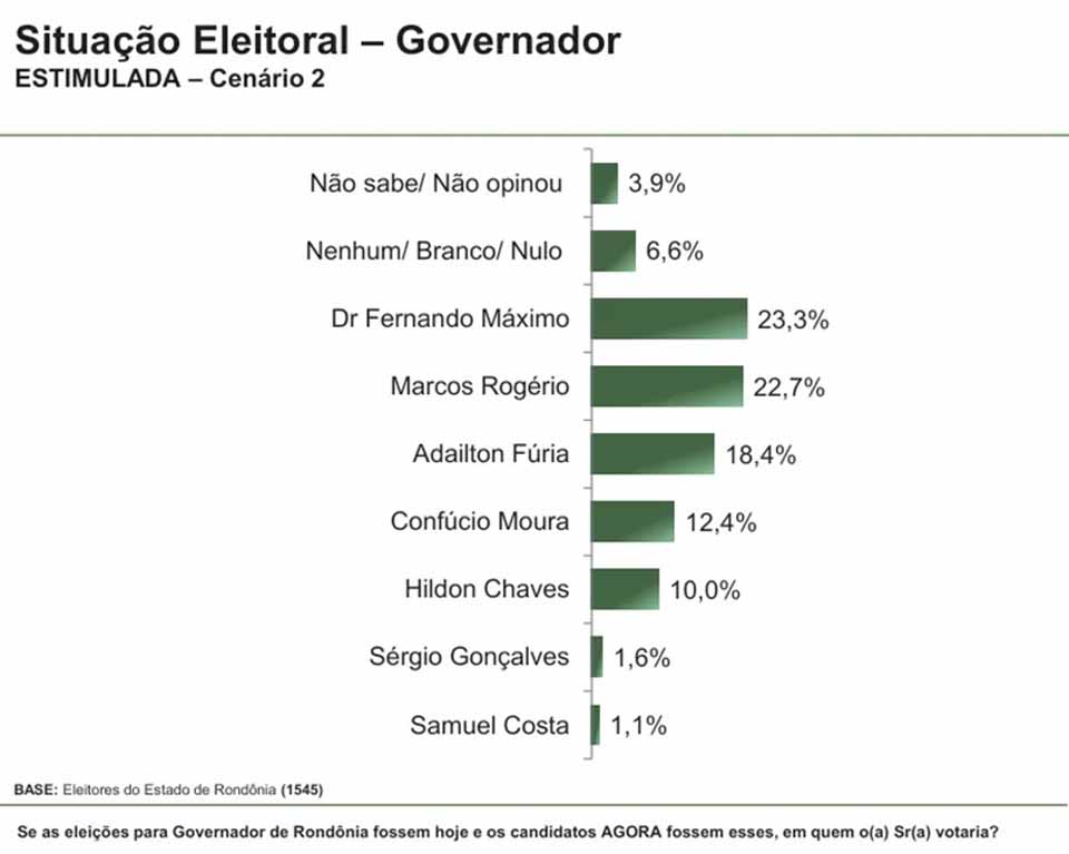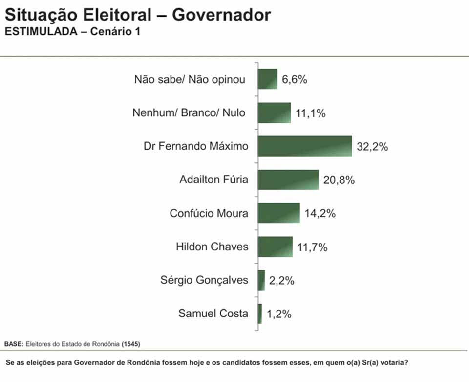 No primeiro cenário estimulado, Fernando Máximo registrou 32,2% das intenções de voto. Em seguida aparecem o prefeito de Cacoal, Adailton Fúria, com 20,8%, o senador Confúcio Moura, com 14,2%, e o ex-prefeito de Porto Velho, Hildon Chaves, com 11,7%. O vice-governador Sérgio Gonçalves marcou 2,2% e Samuel Costa, 1,2%. Entre os que não responderam ou preferiram não opinar, foram 6,6%, enquanto votos nulos, brancos ou em nenhum candidato somaram 11,1%.