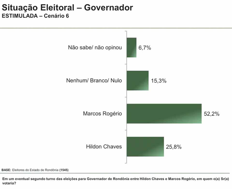 Nos cenários de segundo turno, Fernando Máximo também lidera em disputas diretas contra Hildon Chaves (50,9% a 21,4%) e contra Adailton Fúria (49,6% a 27,8%). Em confronto com Marcos Rogério, os números ficaram próximos, com 41,8% para Máximo e 39,5% para o senador. Já na simulação entre Rogério e Hildon, o senador obteve 52,2% contra 25,8%. Em eventual disputa entre Rogério e Fúria, Rogério marcou 50,1%, enquanto Fúria ficou com 29,5%.