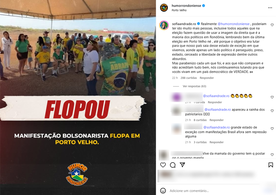 Na imagem divulgada pela página de humor, é possível ver um grupo pequeno de pessoas reunido sob uma tenda, vestindo camisetas verde e amarelas e portando bandeiras do Brasil. A legenda da publicação dizia: “FLOPOU — Manifestação bolsonarista flopa em Porto Velho”.