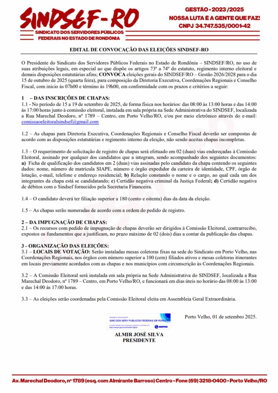 Porto Velho;RO - O Presidente do SINDSEF-RO, Almir José Silva, no uso de suas atribuições estatutárias, convoca eleições gerais do SINDSEF-RO, gestão 2026/2028, para o dia 15 de outubro, para oa composição da direitoria executiva, cordenações regionais e conselhos fiscais. confira na integra: