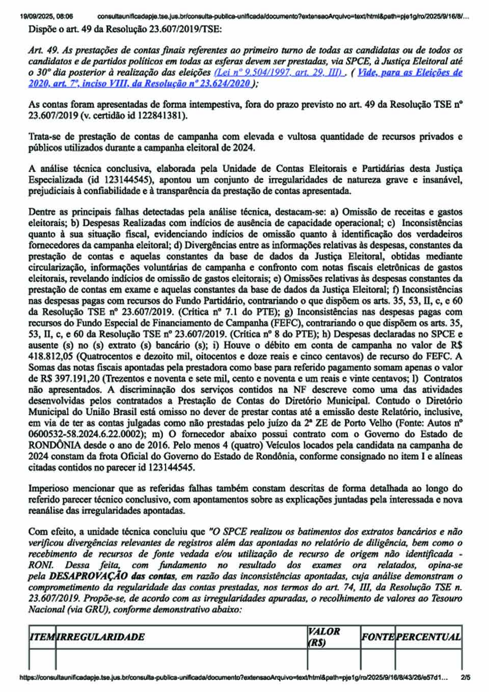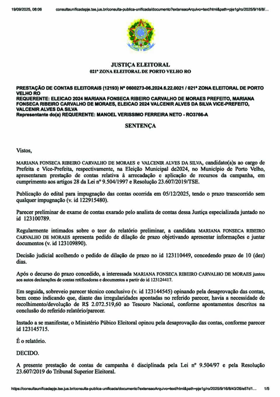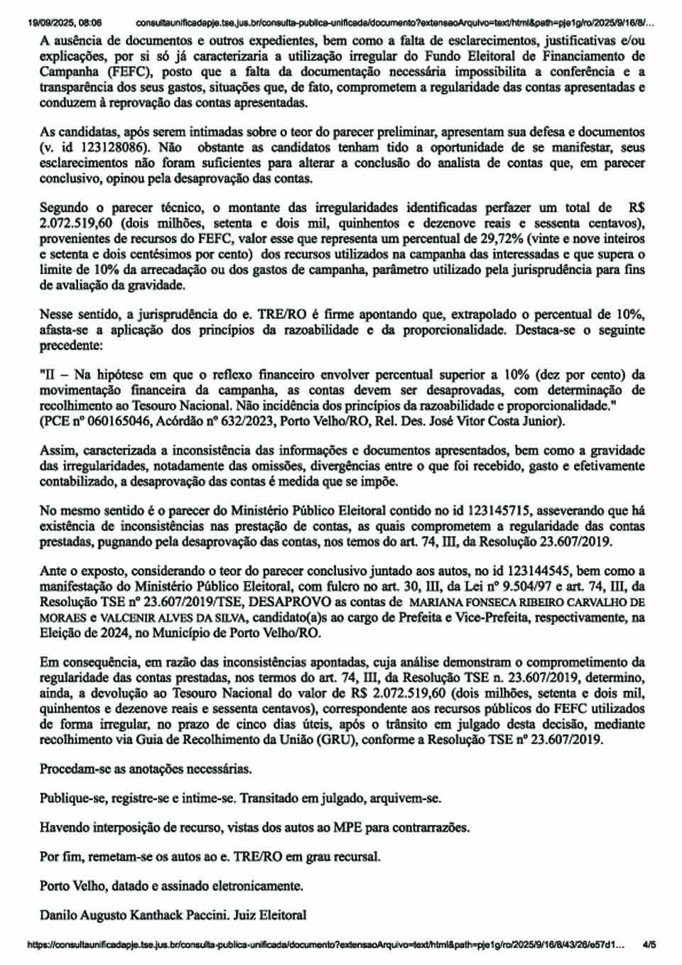 Porto Velho – A Justiça Eleitoral de Rondônia julgou irregulares as contas de campanha da chapa encabeçada por Mariana Fonseca Ribeiro Carvalho de Moraes e Valcenir Alves da Silva, que disputaram os cargos de prefeita e vice-prefeito de Porto Velho nas eleições municipais de 2024. A decisão foi proferida pelo juiz da 21ª Zona Eleitoral, Danilo Augusto Kanthack Paccini, que determinou a desaprovação das contas e o recolhimento de R$ 2.072.519,60 ao Tesouro Nacional.