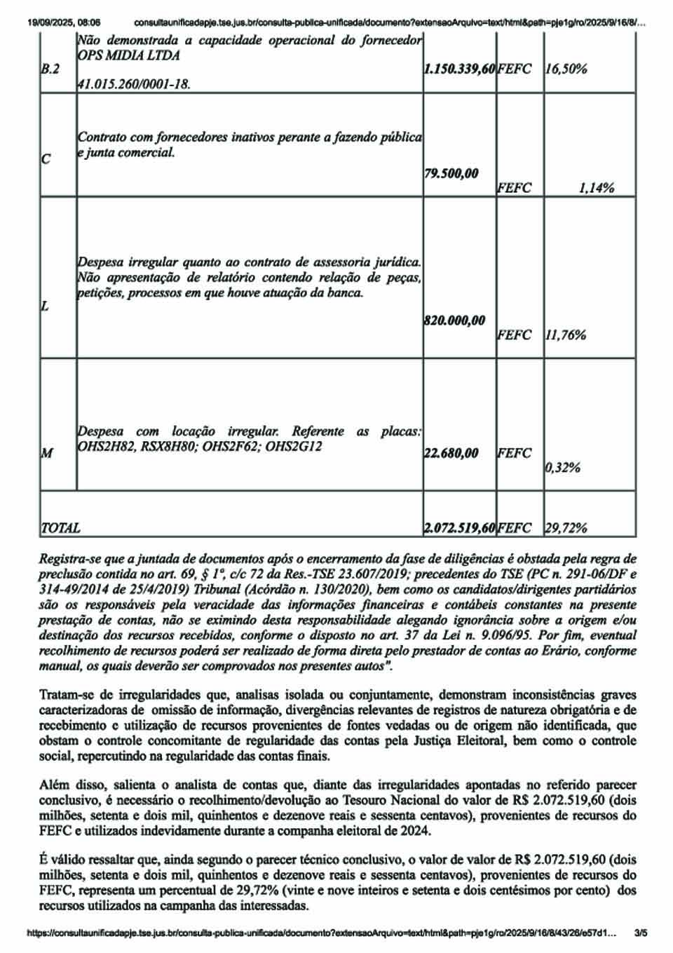 O montante de recursos considerados irregulares corresponde a 29,72% do total movimentado na campanha. A decisão destacou que esse percentual supera o limite de 10% estabelecido pela jurisprudência como parâmetro para aplicação dos princípios da proporcionalidade e da razoabilidade, o que afasta a possibilidade de aprovação com ressalvas.