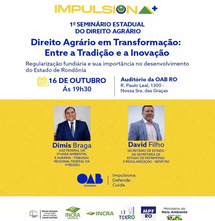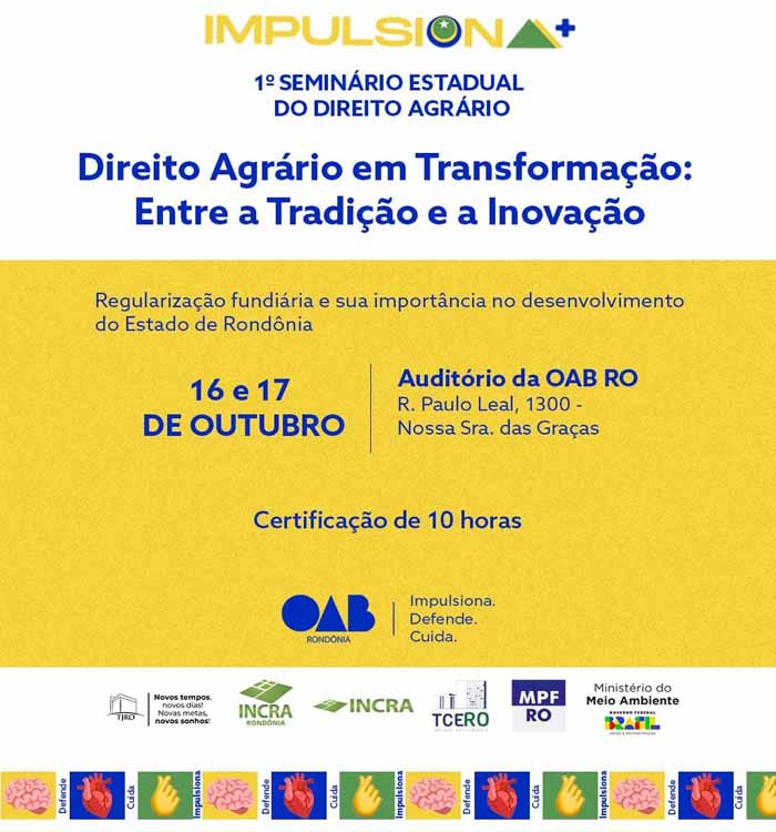 A Comissão de Direito Agrário da OAB Rondônia, presidida pela advogada Dra. Luciene Cândido e tendo como vice-presidente a Dra. Mileni Mota, realizará nos dias 16 e 17 de outubro, em Porto Velho, o 1º Seminário Estadual de Direito Agrário, com o tema “Direito Agrário em Transformação: entre a Tradição e a Inovação”.