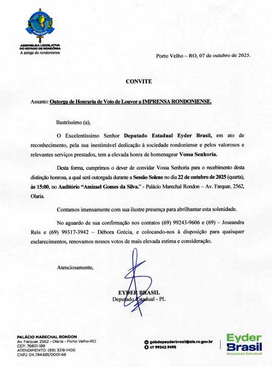 O deputado estadual Eyder Brasil propôs Voto de Louvor que será concedido no dia 22 de outubro, na Assembleia Legislativa de Rondônia, a aproximadamente 400 jornalistas e servidores da imprensa rondoniense.