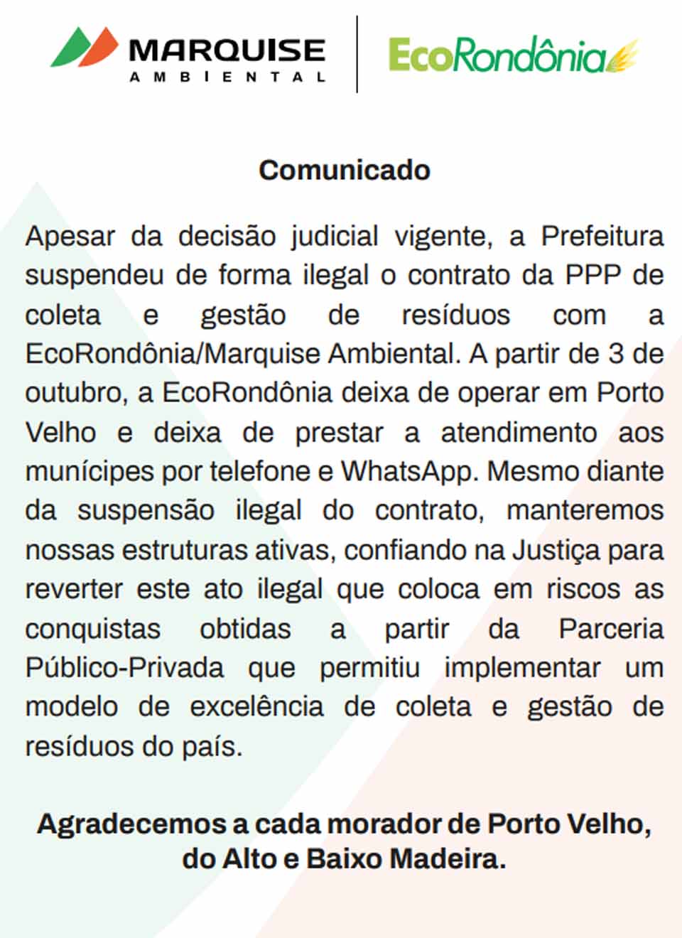 Em nota oficial intitulada “Comunicado” e assinada pelas marcas Marquise Ambiental e EcoRondônia, a empresa informou que a Prefeitura suspendeu o contrato da Parceria Público-Privada (PPP) de coleta e gestão de resíduos. Segundo o texto, a medida ocorreu “apesar da decisão judicial vigente”.
