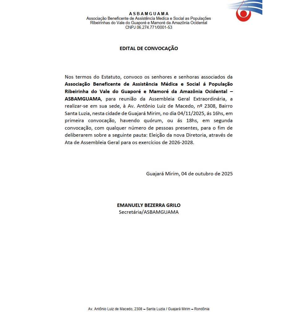 Edital da ASBAMGUAMA convoca associados para eleição da nova diretoria (2026–2028)
