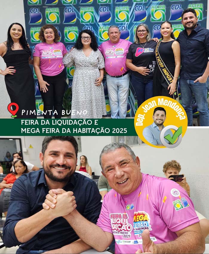 O deputado estadual Jean Mendonça anunciou a destinação de R$ 120 mil em emenda parlamentar para apoiar a realização da Feira de Liquidação e do Mega Feirão da Habitação, programados para ocorrer nos dias 15 e 16 de novembro, em Pimenta Bueno.