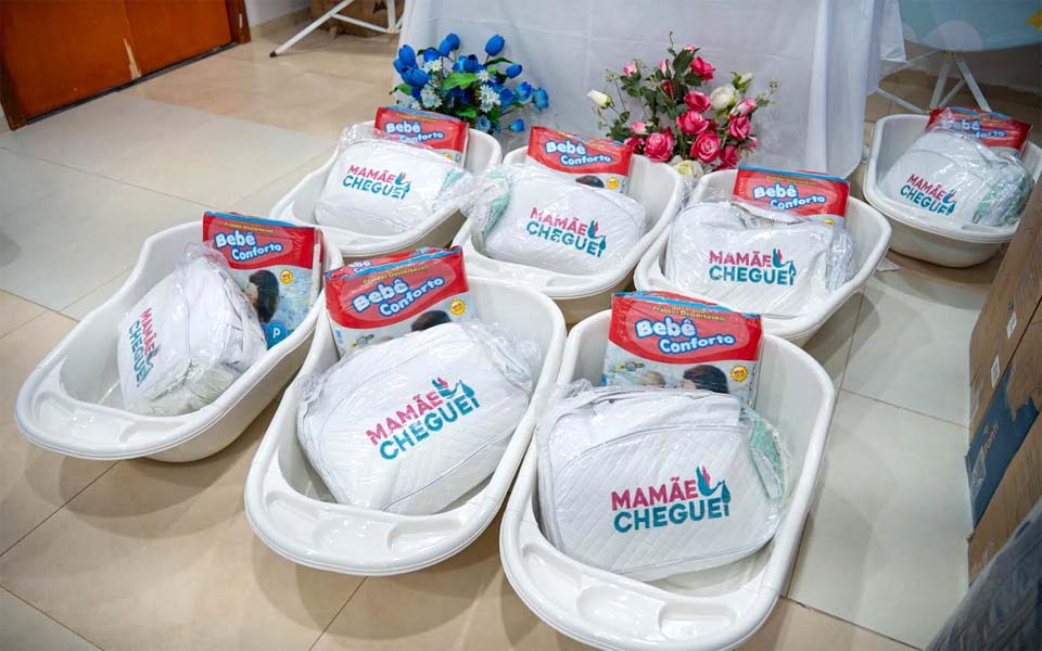 Os kits são compostos por banheira, fraldas, pomada para assaduras, roupinhas, álcool, lenço umedecido, sabonete, berço, entre outros itens essenciais para os primeiros cuidados com o bebê.