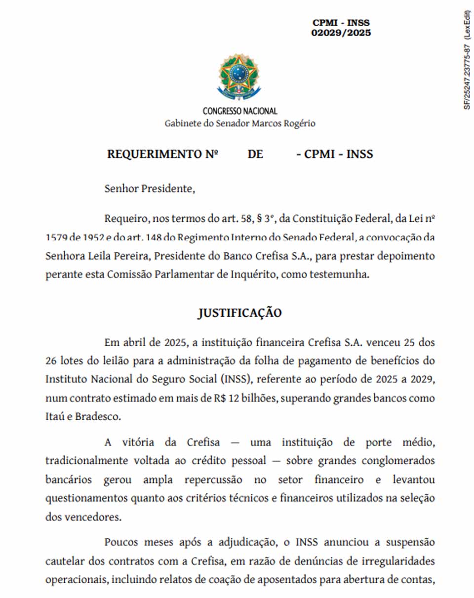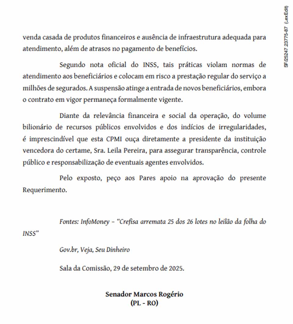No documento, o senador destacou que a Crefisa venceu 25 dos 26 lotes do leilão realizado em abril de 2025 para administrar a folha de pagamento dos benefícios previdenciários. O contrato, estimado em mais de R$ 12 bilhões, abrange o período de 2025 a 2029 e superou propostas de bancos como Itaú e Bradesco. Marcos Rogério apontou que a conquista da instituição, considerada de porte médio e voltada tradicionalmente ao crédito pessoal, causou repercussão no setor financeiro e levantou questionamentos sobre os critérios técnicos e financeiros utilizados.