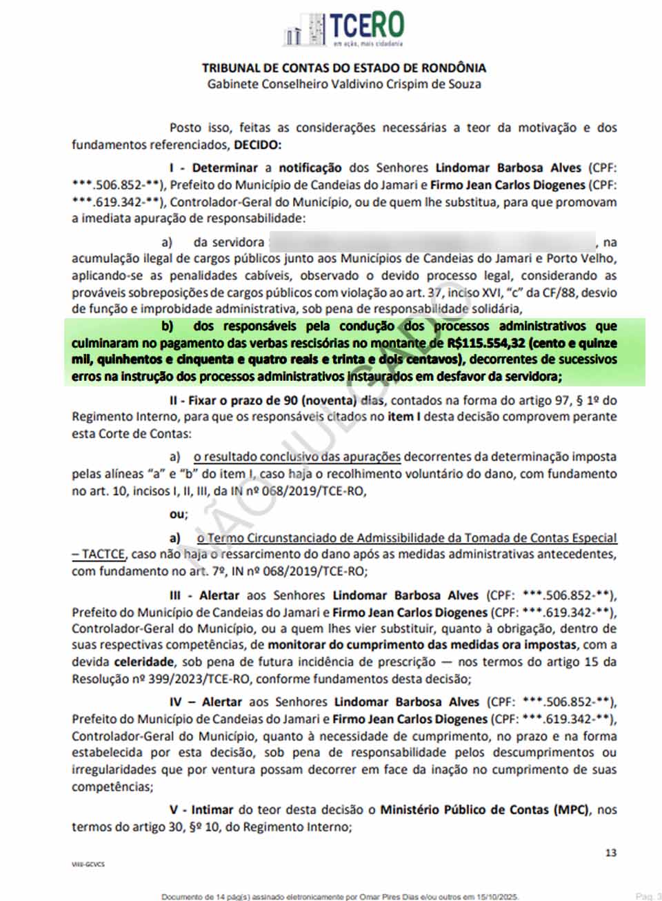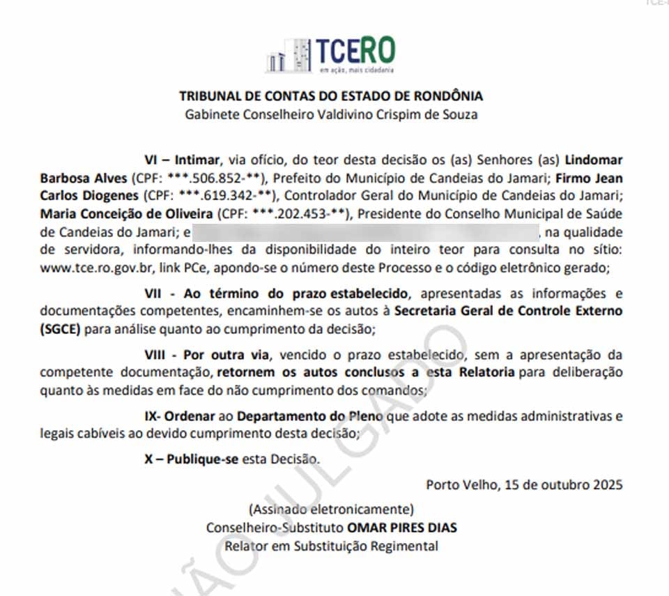 Porto Velho, RO – O Tribunal de Contas do Estado de Rondônia (TCE-RO) determinou a notificação do prefeito de Candeias do Jamari, Lindomar Barbosa Alves, o Lindomar Garçon (foto), e do controlador-geral do município, Firmo Jean Carlos Diogenes, para apuração imediata de responsabilidades em processo que trata de possível acúmulo ilegal de cargos públicos, desvio de função e concessão indevida de verbas rescisórias. A decisão monocrática é do conselheiro-substituto Omar Pires Dias, relator em substituição regimental, proferida em 15 de outubro de 2025, no âmbito do Processo 02307/24/TCERO, que tramita como denúncia e ainda não foi julgado.