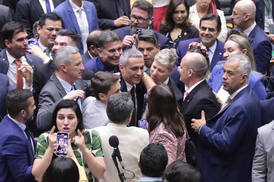 Gustavo Gayer é abraçado por colegas de parlamento após resultado da votação / Reprodução-Câmara dos Deputados