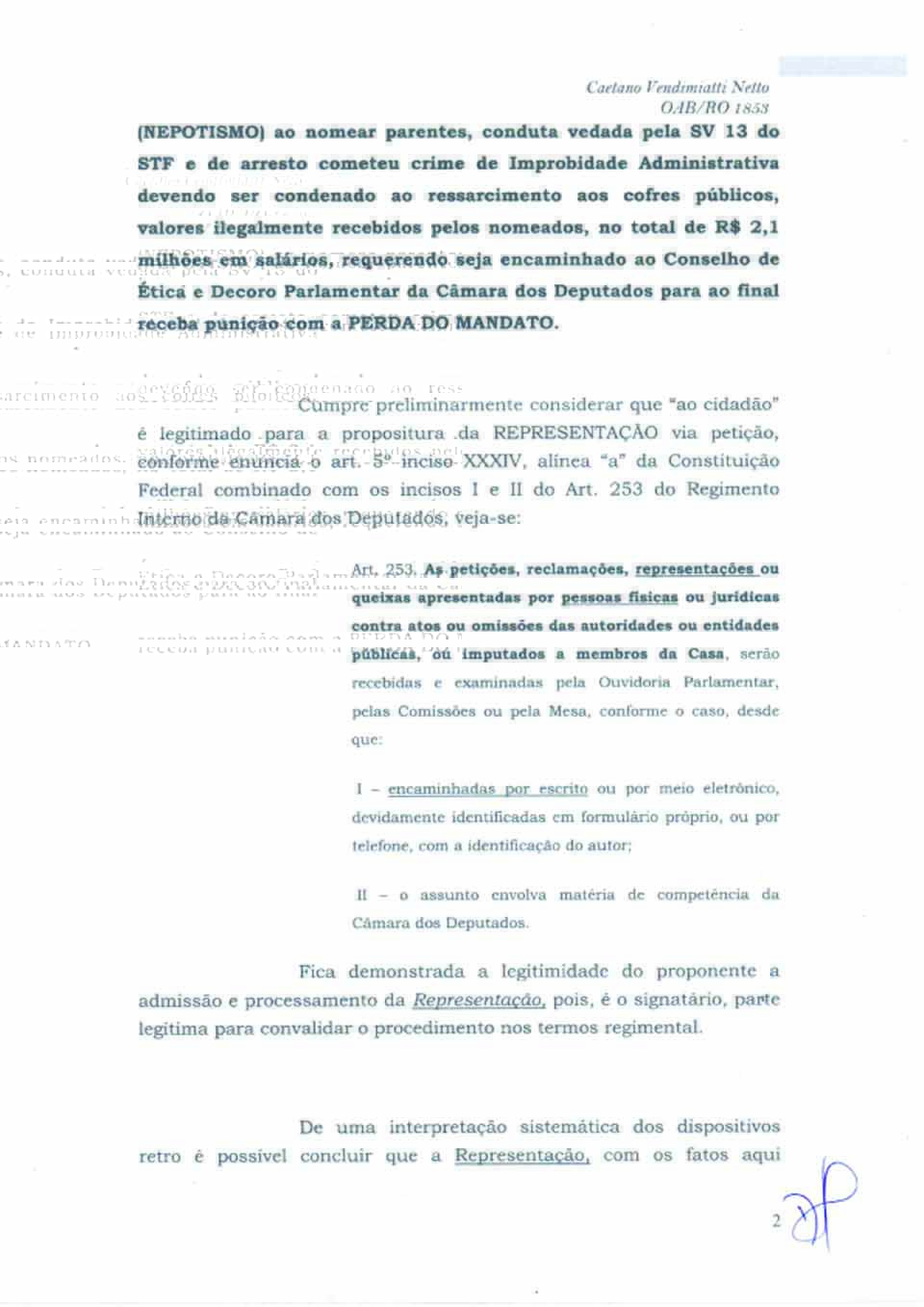 O texto destaca que qualquer cidadão tem o direito de representar contra atos ou omissões de agentes públicos, com base no artigo 5º, inciso XXXIV, da Constituição Federal, e no artigo 253 do Regimento Interno da Câmara dos Deputados. A representação foi assinada em Porto Velho e encaminhada oficialmente à Presidência da Câmara, acompanhada de cópias das reportagens que embasam a denúncia.