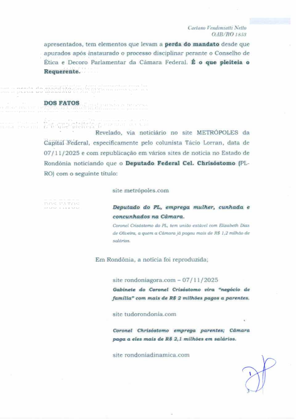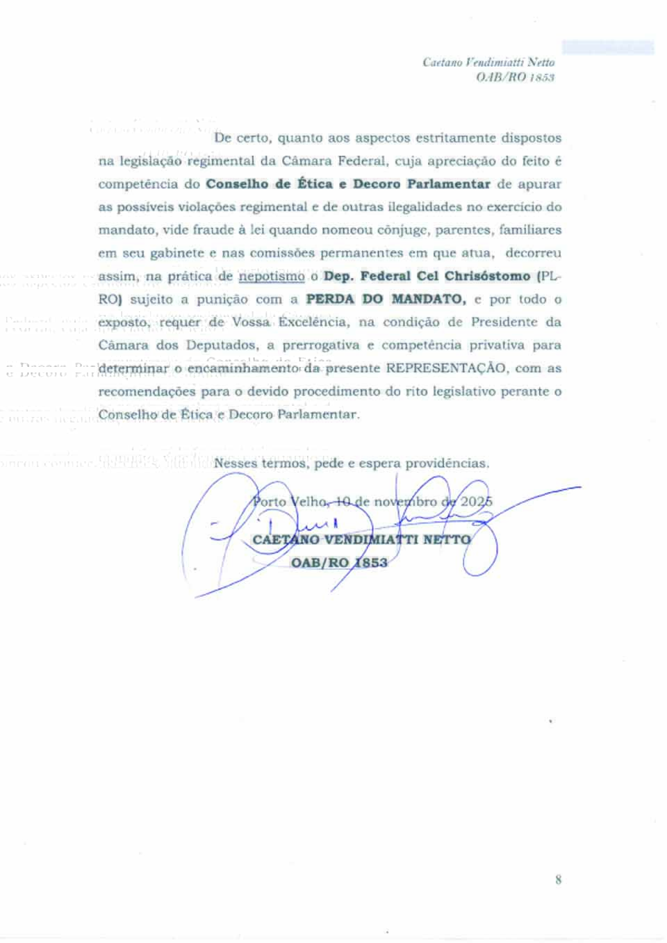 PORTO VELHO (RO) - O advogado Caetano Vendimiatti Netto protocolou nesta segunda-feira (10) uma representação na Câmara dos Deputados contra o deputado federal Coronel João Chrisóstomo de Moura (PL-RO), o Coronel Chrisóstomo. O pedido foi direcionado ao presidente da Casa, Hugo Motta (Republicanos-PB), e solicita que o parlamentar seja investigado pelo Conselho de Ética e Decoro Parlamentar por suposta prática de nepotismo.