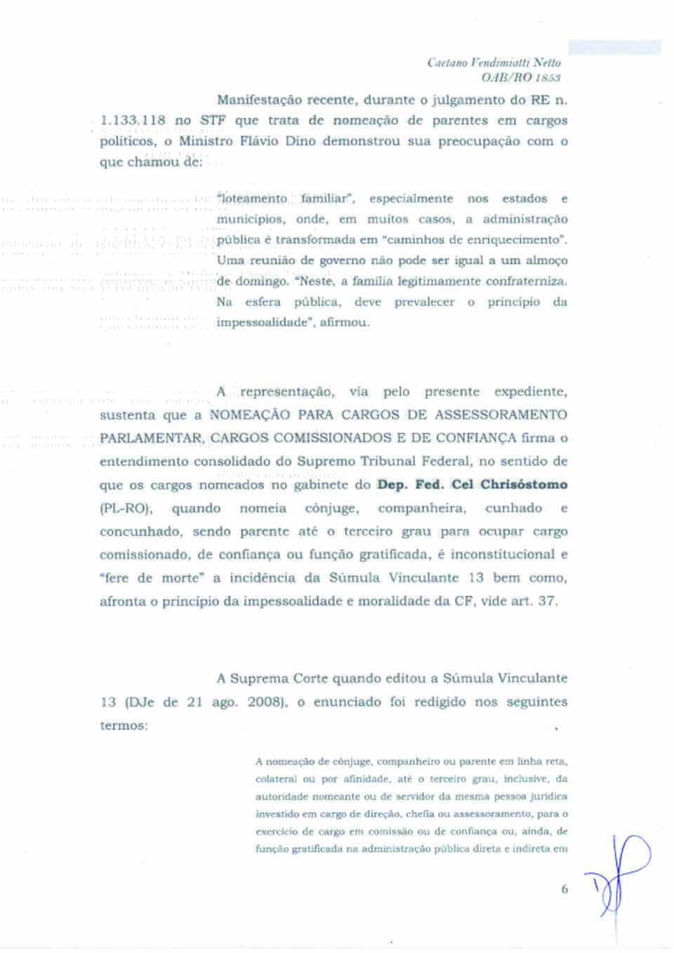 Vendimiatti sustenta que as nomeações configuram afronta à Súmula Vinculante 13 do Supremo Tribunal Federal, que proíbe a nomeação de cônjuges, companheiros e parentes até o terceiro grau para cargos de confiança na administração pública. Ele cita ainda manifestação do ministro Flávio Dino no julgamento do Recurso Extraordinário 1.133.118, quando o magistrado alertou para o “loteamento familiar” no serviço público e defendeu o princípio da impessoalidade na gestão.