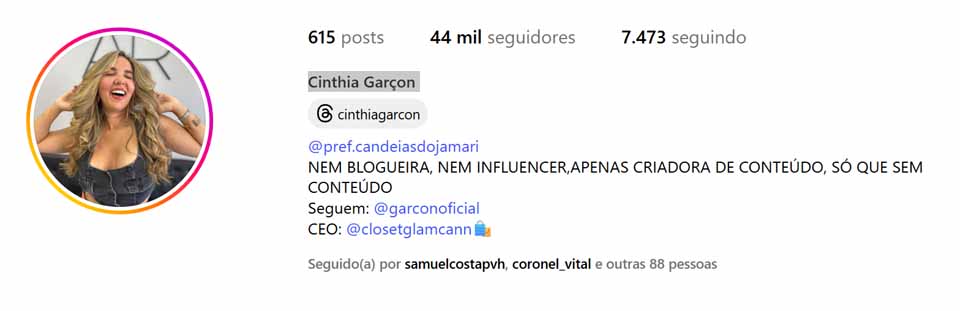 Porto Velho, RO — A Justiça de Rondônia condenou a criadora de conteúdo digital Cinthia Garçon, filha do prefeito de Candeias do Jamari e ex-deputado federal, pelo crime de difamação cometido contra uma adolescente em sua rede social. A decisão foi assinada pelo juiz Flávio Henrique de Melo, na última terça-feira, 04, e reconheceu que a publicação feita por Cíntia, na época com mais de 28 mil seguidores no Instagram, causou dano à honra da vítima. Cabe recurso.