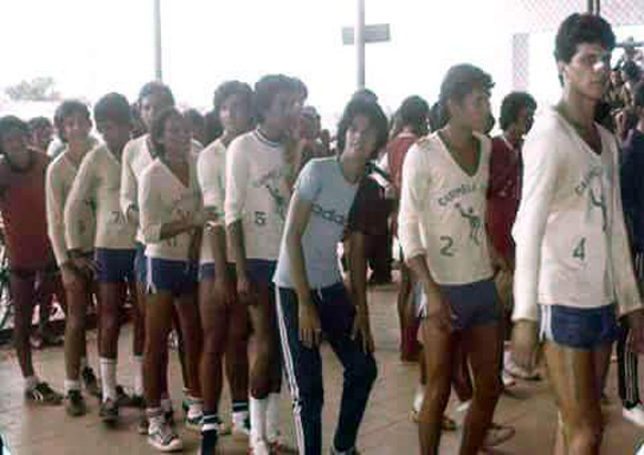 Antônio Tabosa, o primeiro da fila, competindo no Joer na modalidade handebol, entre 1976 e 1980