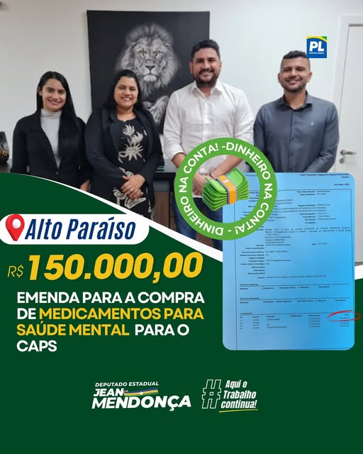 A prefeitura de Alto Paraíso recebeu o repasse de uma emenda parlamentar no valor de R$ 150 mil, destinada à aquisição de medicamentos voltados ao atendimento de pacientes do Centro de Atenção Psicossocial (CAPS). O recurso foi encaminhado por meio do mandato do deputado Jean Mendonça.