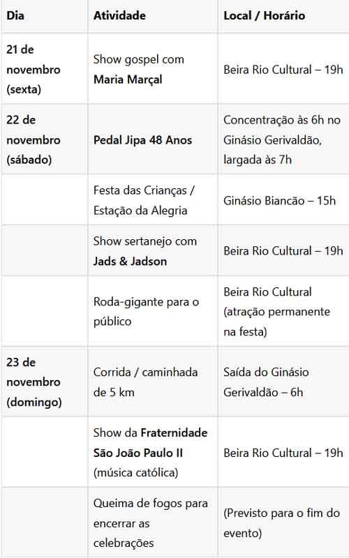 As celebrações incluem três dias de programação, entre 21 e 23 de novembro, organizados pela Prefeitura Municipal. Os eventos são gratuitos e direcionados à comunidade, com atividades voltadas para crianças, famílias, esportistas e público amante de música. Entre as ações, há atrações musicais, esportivas e opções de lazer.