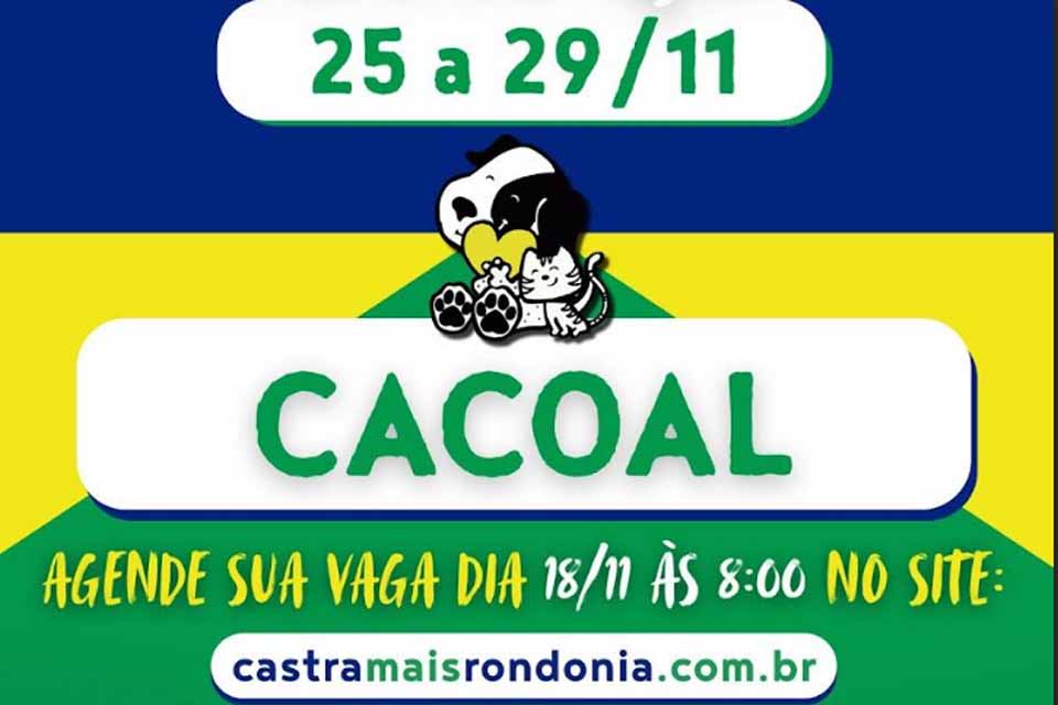 O município de Cacoal será contemplado, no período de 25 a 29 de novembro, pelo Castra +. O programa chega à cidade, por meio de parceria firmada entre o deputado federal Fernando Máximo,deputado estadual Cirone Deiró e a vereadora Nice Condaque. A Associação Vira Lata Vira Amor também deverá participar da ação. Os interessados devem fazer seus cadastros pelo site castramaisrondonia.com.br