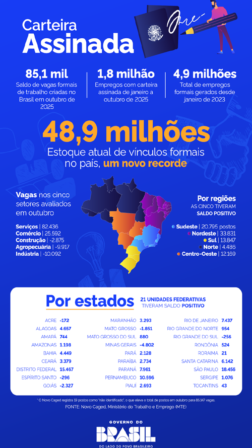 NACIONAL – O Brasil alcançou o patamar de 1,8 milhão de empregos com carteira assinada entre janeiro e outubro de 2025, com saldos positivos nas 27 Unidades da Federação e em todos os grandes grupamentos econômicos no período. O resultado elevou o número total de vínculos formais ativos ao recorde de 48,99 milhões no país. Desde janeiro de 2023, início da atual gestão do Governo do Brasil, já são 4,9 milhões de vagas formais criadas.