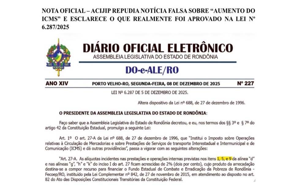 A ACIJIP esclarece que a Lei 6.287/2025 não promoveu aumento de ICMS sobre celulares, geladeiras, computadores, veículos ou qualquer outro eletrodoméstico ou item de tecnologia. Conforme a nota, a legislação apenas ajustou o artigo 27-A da Lei 688, de 27 de dezembro de 1996, mantendo um adicional de 2% do Fundo Estadual de Combate e Erradicação da Pobreza (FECOEP) exclusivamente para produtos que já estavam previstos anteriormente.