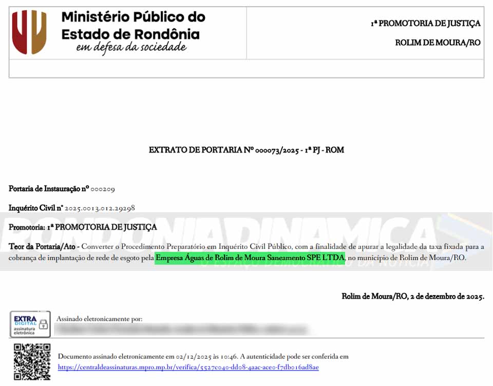 PORTO VELHO (RO) – A 1ª Promotoria de Justiça de Rolim de Moura instaurou, na última terça-feira, 02, um Inquérito Civil para investigar a legalidade da taxa cobrada pela Águas de Rolim de Moura Saneamento SPE Ltda referente à implantação de rede de esgoto no município. A apuração foi formalizada por meio do Extrato de Portaria nº 000073/2025 – 1ª PJ – ROM, vinculado à Portaria de Instauração nº 000209 e ao Inquérito Civil nº 2025.0013.012.29298.